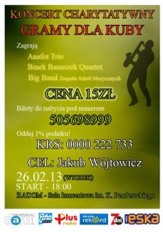 Koledzy nastolatka ze szkoły postanowili kolejny raz zorganizować zbiórkę pieniędzy na ten cel. Jutro, 26 lutego, o godz. 18 w Zespole Szkół Muzycznych w Radomiu odbędzie się koncert charytatywny dla Jakuba. Dla Kuby zagrają uczniowie szkoły muzycznej: Anafot Trio, Binek Banaszek Quartet oraz Big Band Zespołu Szkół Muzycznych w Radomiu. Koszt biletu - cegiełki to 15 zł. Caritas Diecezji Radomskiej na prośbę kolegów Jakuba uruchomił specjalne konto, na które można wpłacać datki na zakup protezy i rehabilitację nastolatka: 45 1240 3259 1111 0000 2989 1757 z dopiskiem "Jakub Wójtowicz". Można też przekazać 1% swego podatku. Należy wpisać do swego PIT-u nr KRS 0000222733 Caritas Diecezji Radomskiej z dopiskiem "Jakub Wójtowicz". Dotychczas zebrana została 1/3 kwoty potrzebnej na zakup protezy.