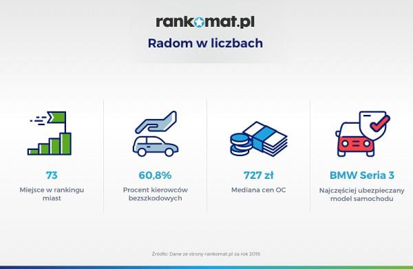 Eksperci rankomat.pl stworzyli listę 84 miast powyżej 50 tys. mieszkańców. Następnie sprawdzili, gdzie kierowcy deklarowali najmniej szkód, wyliczając składkę na ubezpieczenie OC. Radom z wynikiem 60,8% znalazł się na 73 miejscu zestawienia. Niższą bezszkodowość zadeklarowali kierowcy z Lublina (60,7%), Olsztyna (60,1%) i Bydgoszczy (59,7%). Najgorszy wynik odnotowano w Warszawie (53,8%). Dla porównania najlepiej pod tym względem wypadli kierowcy z Raciborza (69,6%), Piły (68,3%) i Rybnika (68,0%).