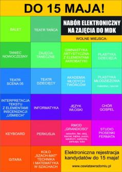 Uwaga! Po rejestracji kandydata należy wydrukować i podpisać wniosek, załączyć dokumenty potwierdzające kryteria dodatkowe (o ile są zaznaczone). Wniosek wraz z dokumentami należy przynieść do MDK przy ul. Słowackiego 17 w Radomiu od pon. do pt. w godz. 8:00-13:00 i włożyć do skrzynki wniosków znajdującej się w korytarzu do 15.05.2020 r.