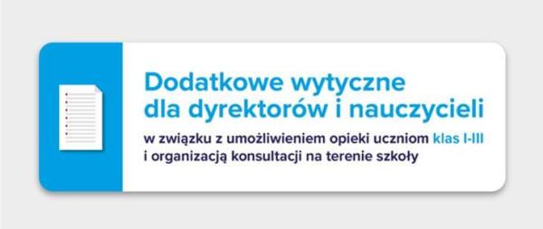 Dyrektor szkoły określi szczegółowy sposób sprawowania opieki, jak i prowadzenia zajęć dydaktycznych dla dzieci, które będą przebywać w szkole. Forma zajęć dydaktycznych jest uzależniona od warunków epidemicznych panujących na terenie gminy, w której szkoła się znajduje oraz od możliwości spełnienia wytycznych Ministra Zdrowia, Głównego Inspektora Sanitarnego oraz Ministra Edukacji Narodowej.