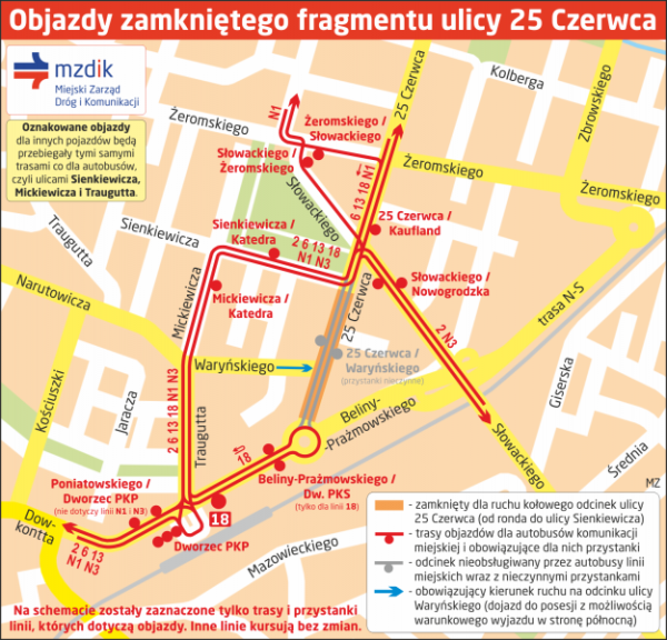 Na trasach tych objazdów będą obowiązywały przystanki Sienkiewicza / Katedra 03 (przy parku, w kierunku Mickiewicza) oraz Mickiewicza / Katedra 02 (obok katedry, w kierunku Sienkiewicza). Zawieszone będzie jednocześnie funkcjonowanie przystanków 25 Czerwca / Waryńskiego 01 i 02 (w obu kierunkach). Przystanki Beliny-Prażmowskiego / Dw. PKS 01 i 04 (po stronie dworca autobusowego i po stronie hotelu Glass) będą podczas obowiązywania powyższych zmian funkcjonowały jedynie dla autobusów linii 18 w stronę Nowej Woli Gołębiowskiej!