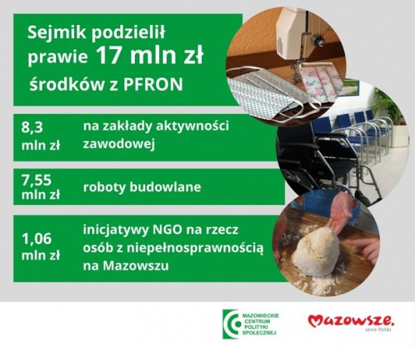Przydzielając te środki, PFRON przyznał 7,45 mln zł na działanie istniejących na Mazowszu dziewięciu zakładów aktywności zawodowej prowadzonych przez: Caritas Diecezji Siedleckiej, Fundację SYNAPSIS, Fundację „Praca dla Niewidomych”, Stowarzyszenie „Gmina Klwów – Wspólne Marzenia”, Fundację Ekonomii Społecznej PRZYSTAŃ, Stowarzyszenie Aktywnej Innowacji Społecznej, Stowarzyszenie „Otwarte Drzwi”, Gminę Promna i Fundację Emanio Arcus. Taka kwota wynika z przyjętego przez PFRON algorytmu. Zarząd województwa podjął jednak decyzję o tym, by tę pulę zwiększyć i teraz do tej decyzji przychylili się radni. To odpowiedź na potrzeby zaz-ów wynikające z sytuacji, w jakiej znalazły się w skutek obostrzeń związanych z epidemią koronawirusa.