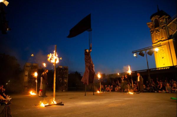 W plenerowym spektaklu „Carmen Funebre” Teatr Biuro Podróży używa spektakularnych środków przyciągających uwagę zarówno doświadczonego widza jak i przypadkowego przechodnia. Szczudła, ogień, efekty świetlne, przejmująca muzyka wywołują wśród publiczności lęk i współczucie. W spektaklu używa się niewielu słów, ale sekwencja sugestywnych obrazów porusza emocje widzów.