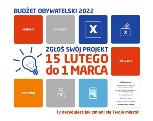 Propozycje projektów do Budżetu Obywatelskiego 2022 może zgłosić każdy mieszkaniec Radomia przez stronę internetową www.konsultacje.radom.pl oraz w punktach stałych: