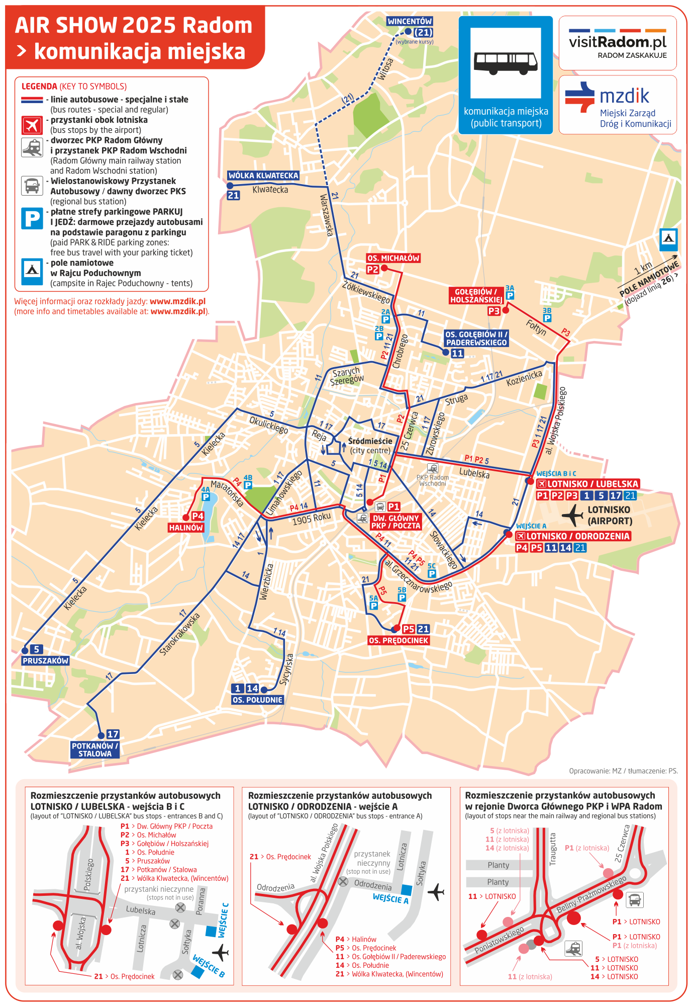 Obok przystanków LOTNISKO / Odrodzenia 06 i LOTNISKO / Lubelska 08 będą dyżurowali pracownicy Miejskiego Zarządu Dróg i Komunikacji w Radomiu (w odblaskowych kamizelkach z napisem Nadzór MZDiK), którzy będą kierowali ruchem autobusów, a w miarę możliwości udzielali pasażerom niezbędnych informacji. Komunikaty będą też wywieszone na punktach biletowych MZDiK.