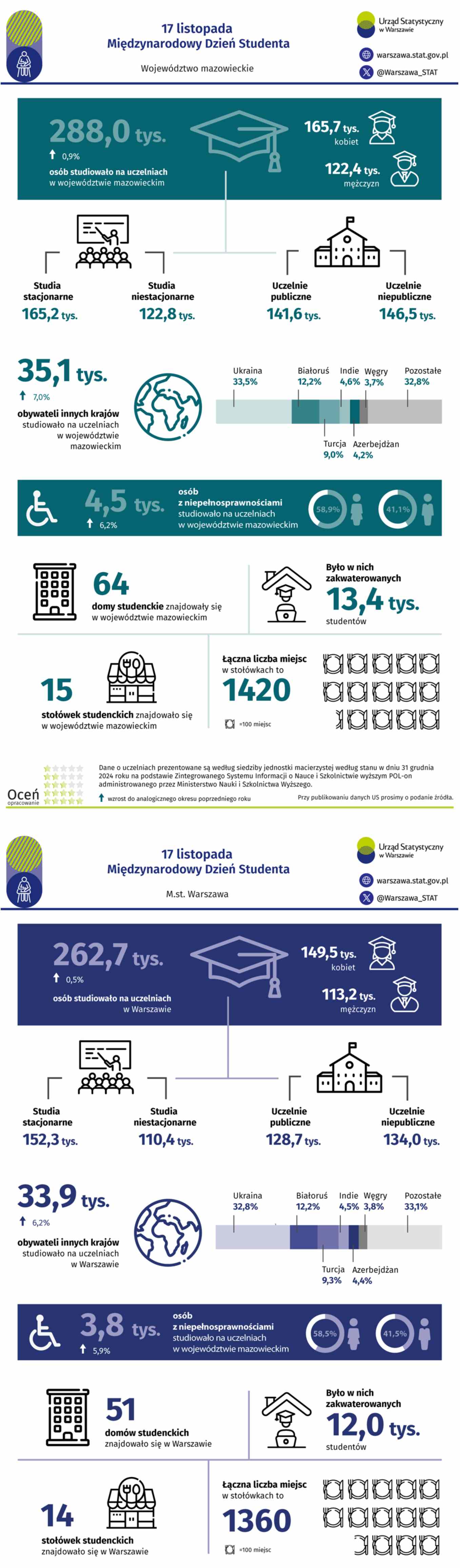 W dniu 31 grudnia 2024 roku na uczelniach, których siedziba mieści się na terenie województwa mazowieckiego, kształciło się 288,0 tys. osób (o 0,9% więcej niż rok wcześniej), w tym 165,7 tys. kobiet i 122,4 tys. mężczyzn. Na studiach stacjonarnych studiowało 165,2 tys. osób, a na niestacjonarnych – 122,8 tys. osób. Uczelnie publiczne wybrało 141,6 tys. osób, a niepubliczne – 146,5 tys. osób.