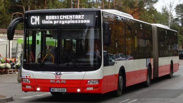 Przez dwa dni będzie uruchomiona linia przyspieszona CM, łącząca cmentarze na Borkach i na Firleju (kursy co około 5-10 minut). Trasa: Maratońska, 1905 Roku, Dowkontta, Poniatowskiego, plac Dworcowy (powrót Poniatowskiego), Traugutta, Żeromskiego (powrót Wałową, Lekarską, Tochtermana), Malczewskiego, Warszawska, Kusocińskiego, Chrobrego, Mieszka I, Ofiar Firleja (powrót Ofiar Firleja, Warszawską, Aleksandrowicza). Na trasie tej linii obowiązują tylko wybrane przystanki.