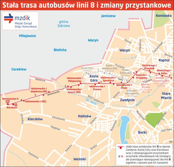 Autobusy linii 8 będą ponownie kursowały stałą trasą - w obu kierunkach ulicami Okulickiego, Kielecką i Wolanowską do pętli Kierzków (a wybranymi kursami, po których następuje zjazd do zajezdni Ślepowron - prosto ulicą Wolanowską do przystanku Wolanowska II). Zostaną one jednocześnie wycofane z ulic Topiel, Przysuskiej i Milejowickiej (w obu kierunkach) oraz Głównej (w kierunku pętli Os. Wośniki).