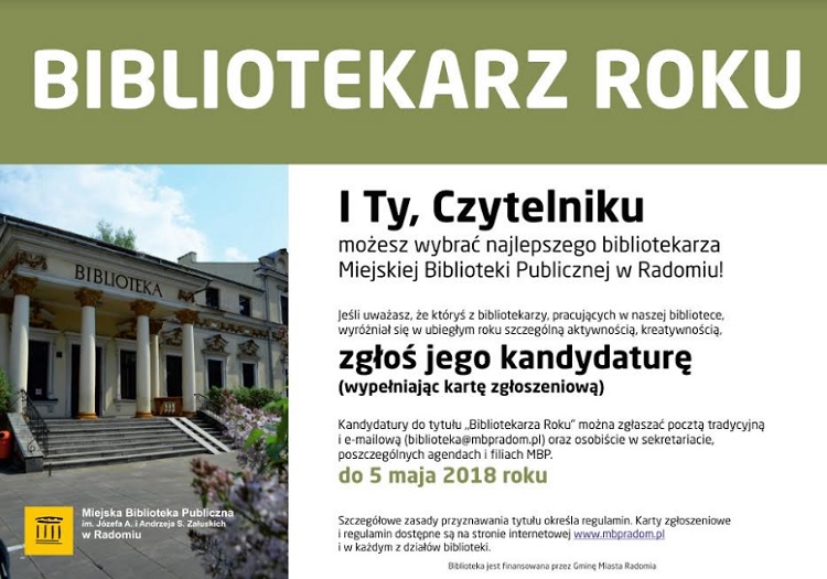Kandydatów do tytułu Bibliotekarza Roku 2018 można zgłaszać osobiście w każdej filii i agendzie biblioteki, w sekretariacie, pocztą tradycyjną (Miejska Biblioteka Publiczna w Radomiu, ul. J. Piłsudskiego 12, 26-600 Radom; z dopiskiem „Bibliotekarz Roku″) lub elektroniczną (biblioteka@mbpradom.pl). Wystarczy wypełnić formularz z krótkim uzasadnieniem swojej propozycji i przekazać go w dowolny sposób. Na zgłoszenia czekamy do 5 maja 2018 r.