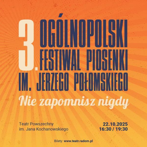 Ogólnopolski Festiwal im. Jerzego Połomskiego „Nie zapomnisz nigdy" organizowany jest w hołdzie legendzie polskiej estrady. Jerzy Połomski (1933-2022) – choć marzył o karierze architekta, został jednym z najważniejszych głosów polskiej estrady. Jerzy Połomski urodził się w Radomiu, mieszkał w przy ul. Kopernika, ukończył technikum budowlane. Po maturze wyjechał na studia do Warszawy. Stał się prawdziwą gwiazda polskiej piosenki i estrady.