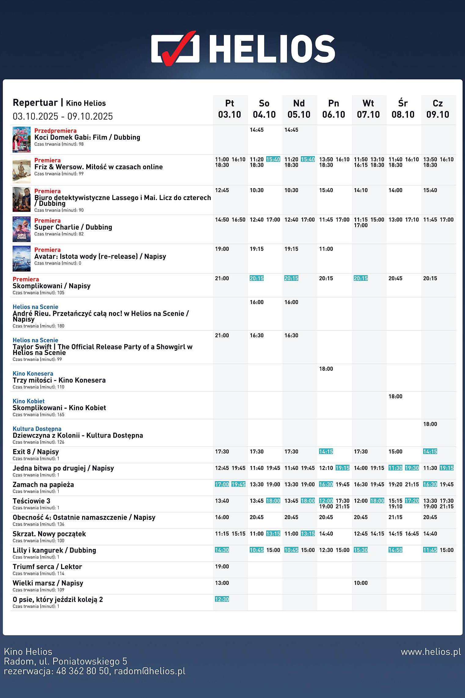 Początek jesieni będzie pełny pozytywnych, filmowych emocji! Szczegóły dotyczące seansów dostępnych w aktualnym repertuarze można znaleźć na stronie: www.helios.pl, w aplikacji mobilnej oraz w kasach kinowych sieci w całej Polsce.