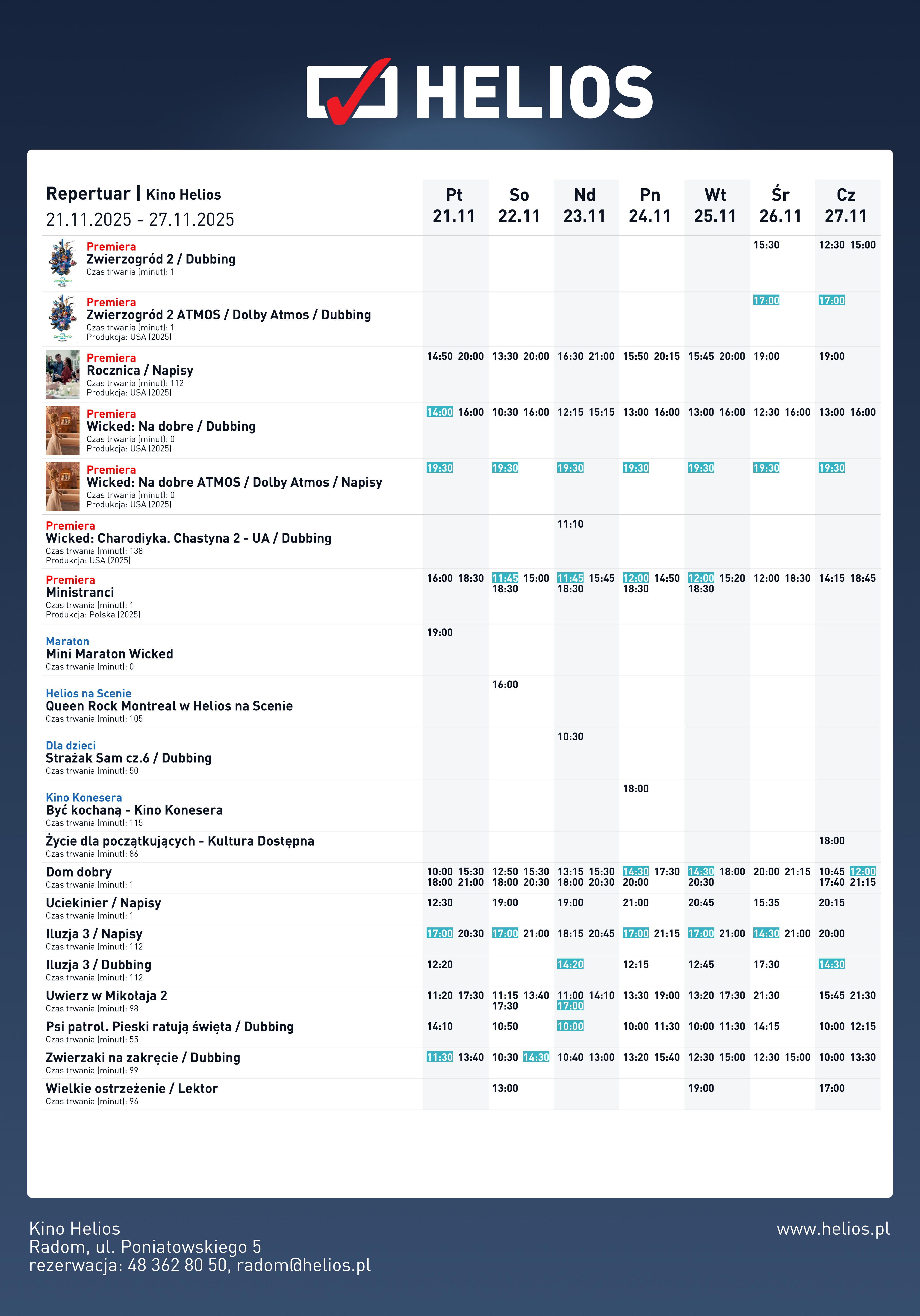 Od najbliższego piątku w repertuarze zagoszczą również premierowe seanse musicalu „Wicked: Na dobre”. Elphaba, demonizowana jako Zła Czarownica z Zachodu, żyje na wygnaniu, pragnąc ujawnić prawdę o Czarodzieju. Tymczasem Glinda stała się symbolem Dobra dla Oz i cieszy się popularnością wśród mieszkańców. Wkrótce przyjaciółki będą musiały zjednoczyć się i ponownie sobie zaufać, by odmienić siebie i całe Oz na dobre. W niedzielę zapraszamy na seans w ukraińskiej wersji językowej. W całej sieci Helios w piątek, 21 listopada odbędzie się również Mini Maraton „Wicked”, w ramach którego widzowie będą mogli zobaczyć obie części tego lubianego musicalu!