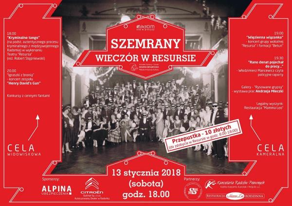 13 stycznia (sobota) Resursa zaprasza na "Szemrany Wieczór w Resursie". Impreza rozpocznie się o godz. 18:00 spektaklem komediowym Teatru Resursa "Kryminalne Tango" w reż. Roberta Stępniewskiego. Przedstawienie jest rekonstrukcją procesu z międzywojennego Radomia opisanym w "Słowie" we wrześniu 1925 r.