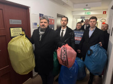 Działacze Konfederacji próbowali złożyć worki pełne plastikowych butelek w biurze poselskim PiS, ale zastali zamknięte drzwi, których nikt z pracowników biura nie zamierzał otworzyć.