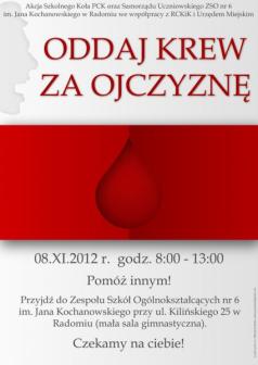 Zbiórka połączona hasłem i ideą ze zbliżającym się Świętem Niepodległości ma na celu promocję krwiolecznictwa w Radomiu, ale przede wszystkim zebranie jak największej ilości "życiodajnej" krwi. Dlatego w zbiórkę krwi, oprócz uczniów i nauczycieli z "Kochanowszczaka", włączą się urzędnicy z sąsiedniego magistratu.