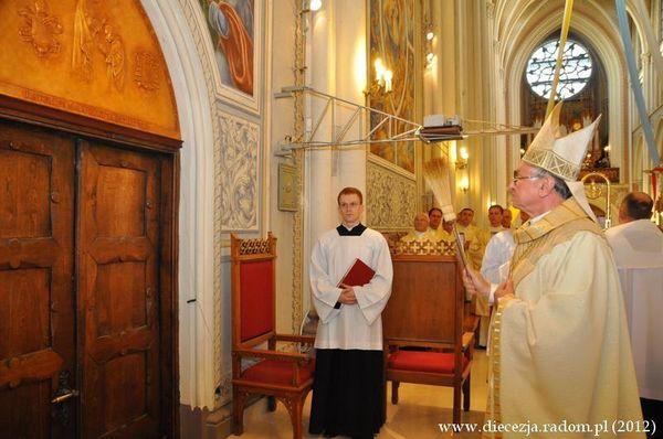 Mszę świętą celebrował abp Zygmunt Zimowski, przewodniczący Papieskiej Rady ds. Służby Zdrowia i Duszpasterstwa Chorych, który w piątek obchodził 10. rocznicę święceń biskupich, których udzielił kard. Ratzinger.Witając wiernych biskup Henryk Tomasik przypomniał, że ówczesne święcenia były pierwszą konsekracją biskupią w Polsce w XXI wieku. Przypomniał też wiele było inicjatyw, które arcybiskup Zygmunt Zimowski podjął w ciągu siedmiu lat swojej biskupiej posługi w diecezji radomskiej. Wymienił rozpoczęcie II Synodu Diecezji Radomskiej, zorganizowanie I Kongresu Eucharystycznego Diecezji Radomskiej, przeprowadzenie w diecezji peregrynacji kopii obrazu Matki Bożej Częstochowskiej oraz przygotowanie koronacji obrazu Matki Bożej Ostrobramskiej w Skarżysku-Kamiennej i Matki Bożej Bolesnej w Kałkowie-Godowie. Wymienił także wybudowanie Ośrodka Edukacyjno-Charytatywnego "Emaus" w Turnie koło Białobrzegów oraz Diecezjalnego Ośrodka Akademickiego w Radomiu. Dzięki jego inicjatywie przy Instytucie Teologicznym w Radomiu powstało "Centrum Myśli Benedykta XVI. Homilię wygłosił abp Wacław Depo. Nawiązał do trwającego II Synodu Diecezji Radomskiej, który przebiega pod hasłem "Czynić Diecezję, Domem i Szkołą Komunii". - Tego będziemy się uczyć, zwłaszcza teraz, wobec różnych wyzwań i kolejnych wiatrów historii. A w tym miejscu jakim jest Radom, w mieście z wyrokiem, mamy prawo słusznie upomnieć się o podstawowe prawa człowieka wierzącego - mówił metropolita częstochowski. Abp Zygmunt Zimowski przemawiając na zakończenie liturgii powiedział, że byłoby wielkim błędem, gdybyśmy na ten jubileusz patrzyli tylko ziemskimi oczami. - Istoty jubileuszy odsłaniają nam oczy wiary - mówił abp Zimowski, dziękując jednocześnie za wizytę kard. Ratzingera w Radomiu, dzisiaj Benedykta XVI. - Skierowałem do niego list dziękując za te 10 lat. Ojciec Święty prosił mnie, abym przekazał wam Jego błogosławieństwo. To jest istotą tej rocznicy - powiedział trzeci ordynariusz radomski. Nawiązując do poświęconej tablicy wyraził nadzieję, że będzie ona przypomnieniem, że mamy trwać w wierze naszych ojców. Na koniec zwrócił się do diakonów, którzy 26 maja przyjmą święcenia kapłańskie. - Życzę wam bracia, abyście w swoim kapłańskim życiu zawsze podzielali troskę Boga o ludzi, szczególne chorych i cierpiących. Słowa podziękowania skierował również ks. Jarosław Wojtkun, rektor Wyższego Seminarium