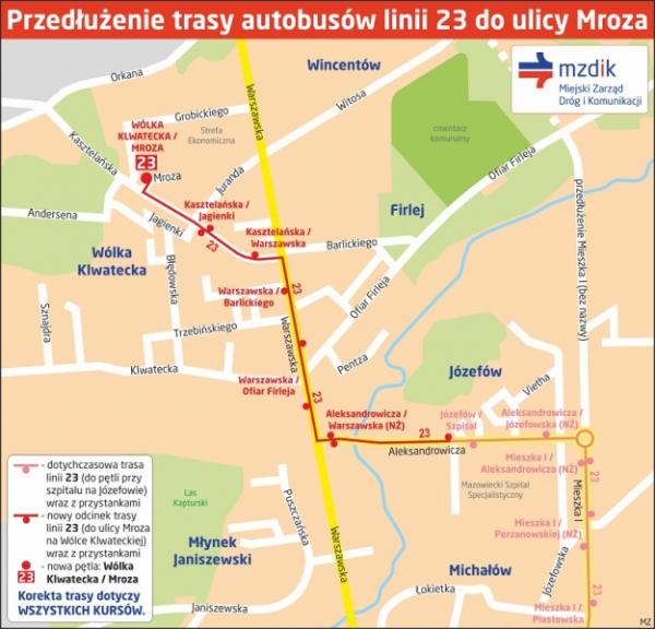 Dla linii 23 przestanie obowiązywać dotychczasowy przystanek końcowy naprzeciwko szpitala na Józefowie. Autobusy będą wszystkimi kursami jeździć dalej - ulicami Aleksandrowicza, Warszawską, Kasztelańską i Mroza - do nowej pętli Wólka Klwatecka / Mroza (zlokalizowanej obok bloku nr 3/5).