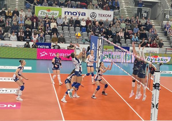 Na chwilę Radomka zagrała jak przystało na trzecią ekipę ligowej tabeli, wygrywając trzy akcje z rzędu by jednak zmarnować dwa meczbole a potem jeszcze jeden. Dopiero czwartego wykorzystały i zakończyły tę męczarnię.