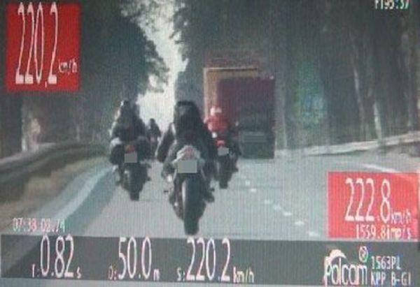 Policjanci z Białobrzegów zatrzymali czterech motocyklistów, którzy pędzili krajową siódemką 220 km/h. Kierowcy zostali ukarani 700 złotowymi mandatami i 13 punktami karnymi za przekroczenie dozwolonej prędkości i niewłaściwe wyprzedzanie, każdy z nich.