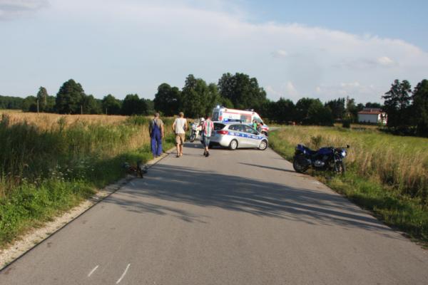 Ppo godz. 17 w miejscowości Huta Skaryszewska 26-latka jadąc od Skaryszewa motocyklem marki honda potrąciła 9-latka, który jechał rowerem w tym samym kierunku. Z wstępnych ustaleń wynika, że chłopiec razem z rodzicami poruszał się lewą stroną drogi i z nieustalonych przyczyn zjechał na prawą stronę jezdni wprost pod nadjeżdżający motocykl. Motocyklistka i 9-latek zostali przewiezieni do szpitala.