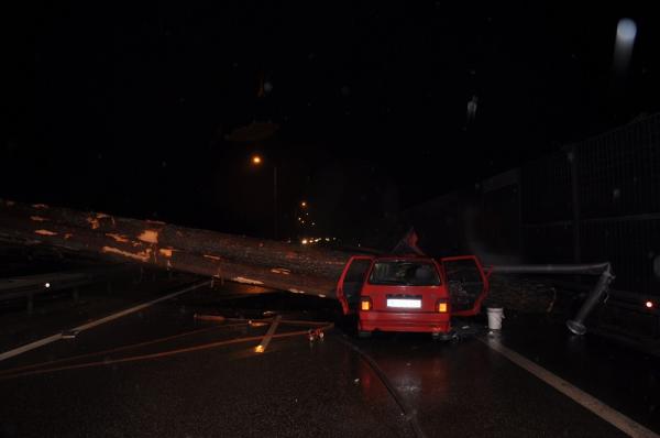 Naczepa wpadła w poślizg przesuwając się na jezdnię prowadzącą w przeciwnym kierunku, a tam ładunek spadł na jadącego fiata uno. Pojazdem tym podróżowało dwóch mężczyzn w wieku 55 i 51 lat. Obaj zostali przewiezieni do szpitala.